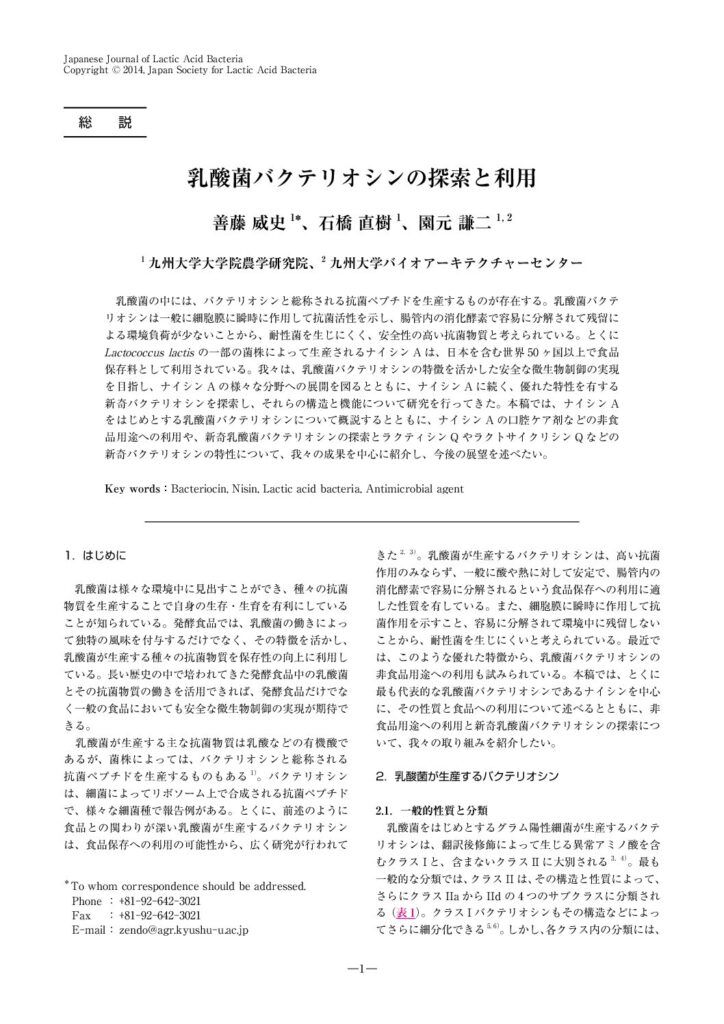 九州大学農学研究院の園元謙二名誉教授は、これまで20種類以上の新規バクテリオシン(抗菌ペプチド)を発見、世界一の発見数を誇る乳酸菌バクテリオシン(抗菌ペプチド)のトップ研究者で世界の第一人者です。