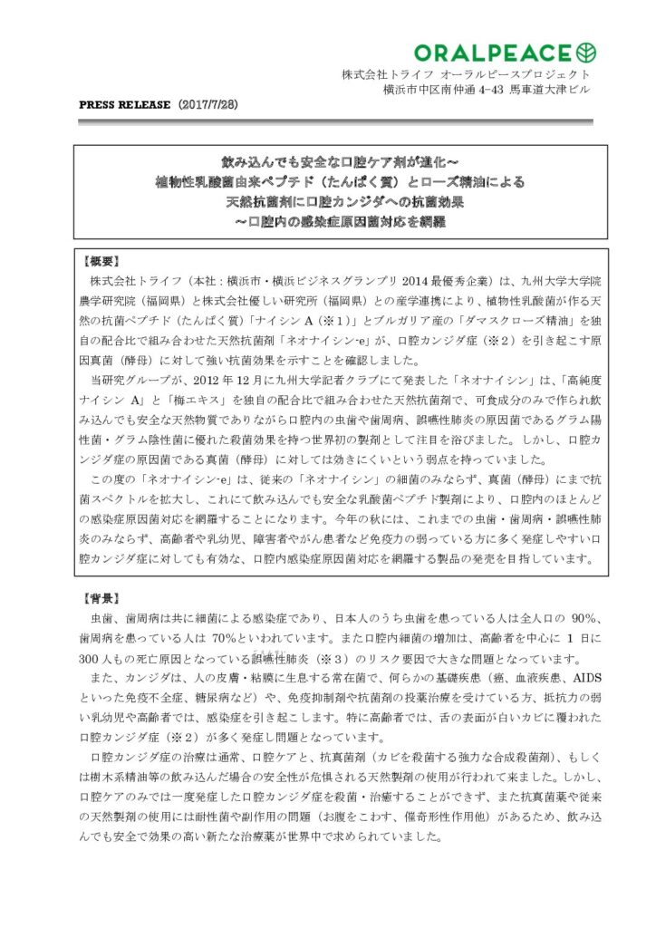さらに2016年には人体にも安全な天然抗菌物質が世界中で待ち望まれていたカンジダ菌(酵母・真菌)にも対応する植物性食品由来の乳酸菌ペプチド特許製剤「ネオナイシン-e(evolution)®」の発明にも成功。