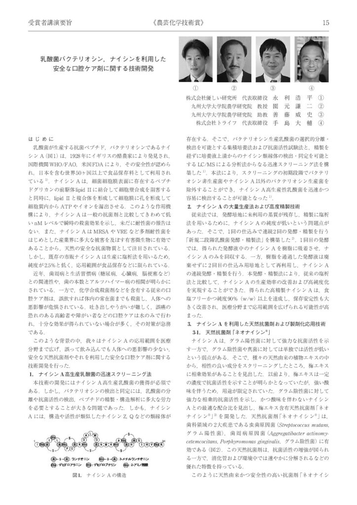 その研究成果が認められ2019年に恩師である園元謙二名誉教授と共に、日本農芸化学技術賞受賞の評価もいただく事になりました。そして2つの特許化が実現しました。